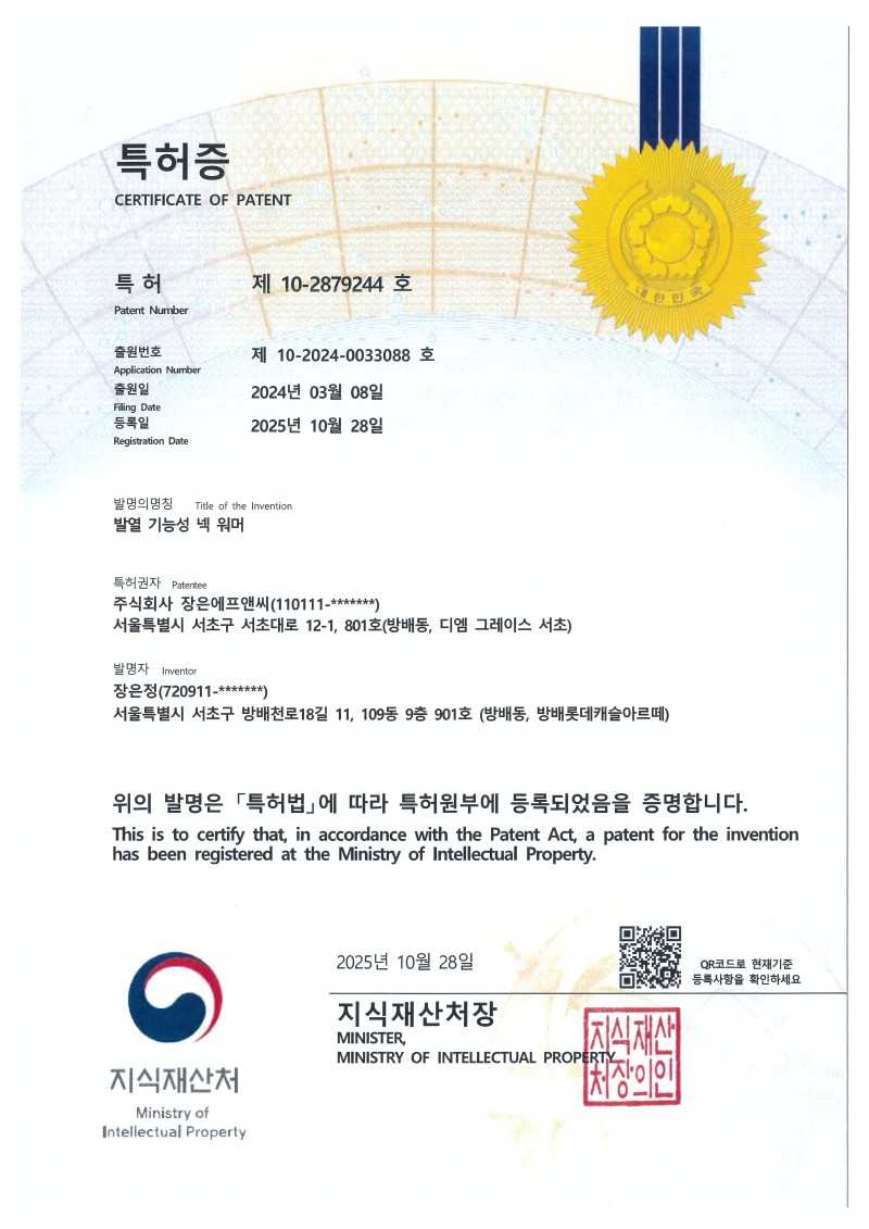 지적재산권 | 특허증 제 10-2879244 호 페이지 정보 작성자 최고관리자 작성일26-01-28 16:24 조회38회 본문 첨부파일 이전글특허증 제 10-2872673 호 26.01.28 다음글디자인등록증 제 30-1257437 호 24.05.20 목록